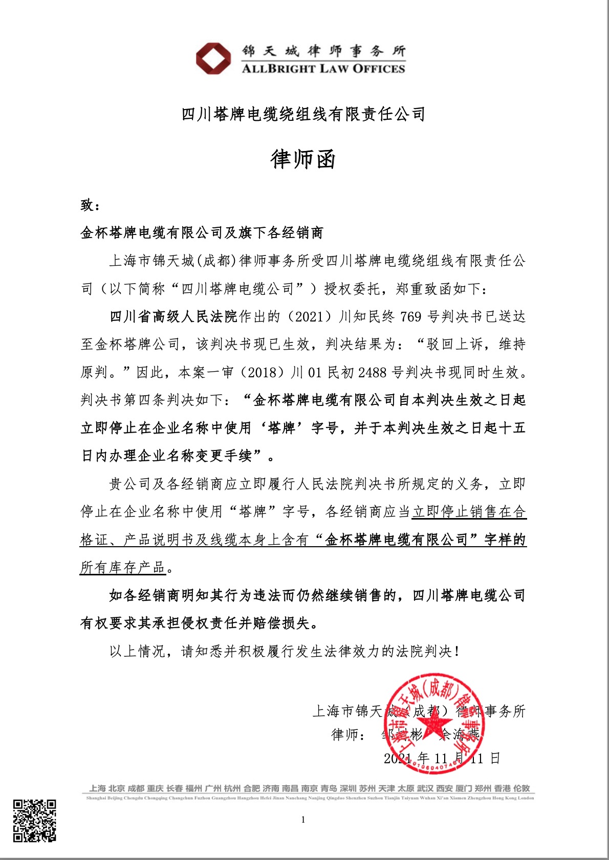 四川塔牌电缆公司致金杯塔牌电缆公司及旗下经销商的律师函