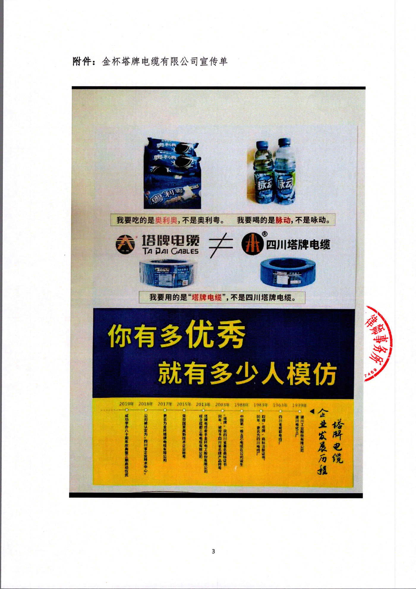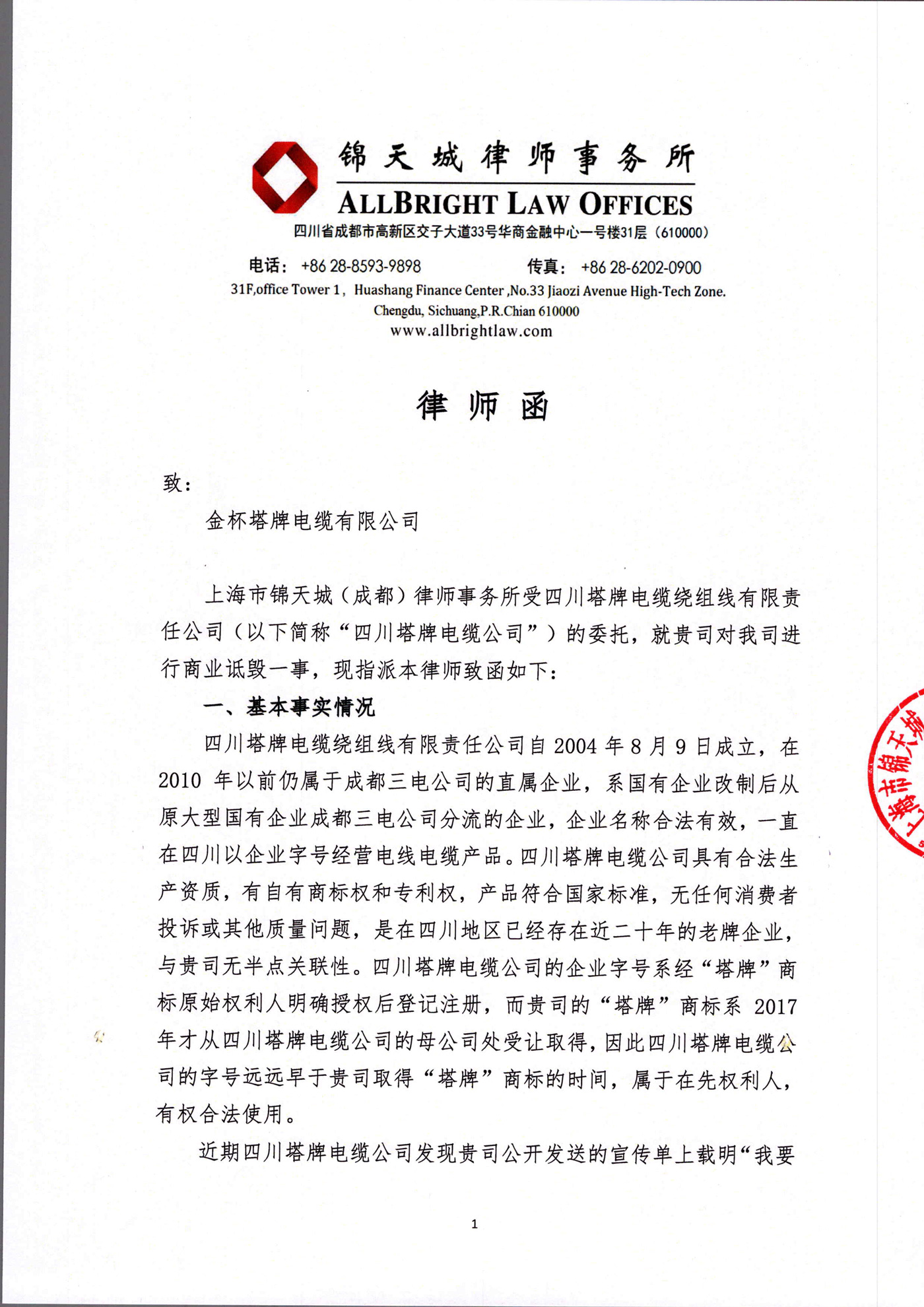 四川塔牌电缆公司致金杯塔牌电缆有限公司律师函